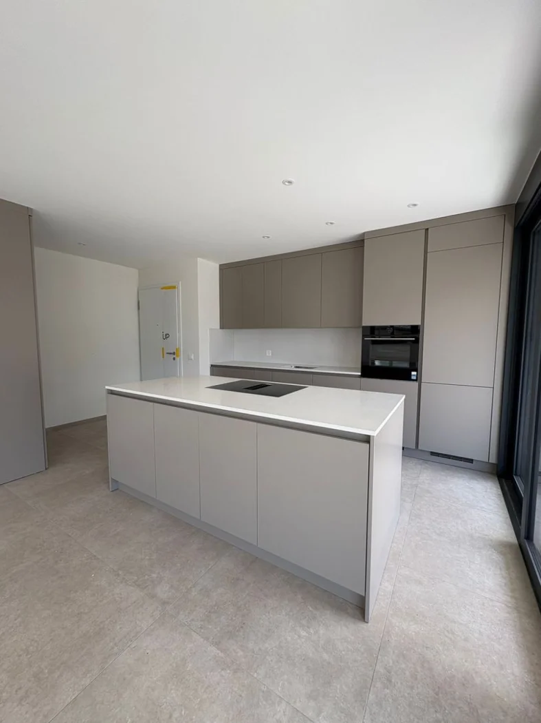 Grande soggiorno con cucina open space, perfetto per vivere momenti di convivialità in un ambiente moderno e accogliente, con accesso diretto alla splendida terrazza.