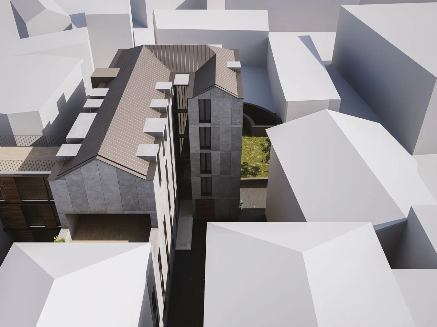 Posteggio coperto con 10 posteggi predisposti per la carica di auto ibride o elettriche.